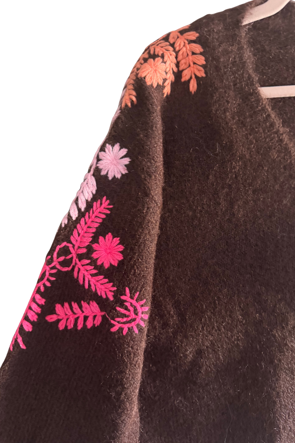 Este jersey marrón de corte ligeramente corto y cuello en V combina comodidad y estilo en una pieza llena de personalidad. Los bordados florales en tonos vibrantes, naranja, rosa y fucsia destacan en las mangas, aportando un contraste precioso. Su tejido suave y mullido lo convierte en una prenda ideal para los días fríos, perfecta para alegrar cualquier look invernal.
